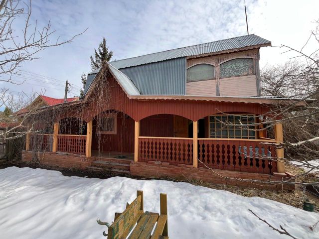 Деревянный дом с эркером в стиле русского зодчества из бревен диаметром 25-33 см. Дом строился для себя в 2004 году, утеплен.